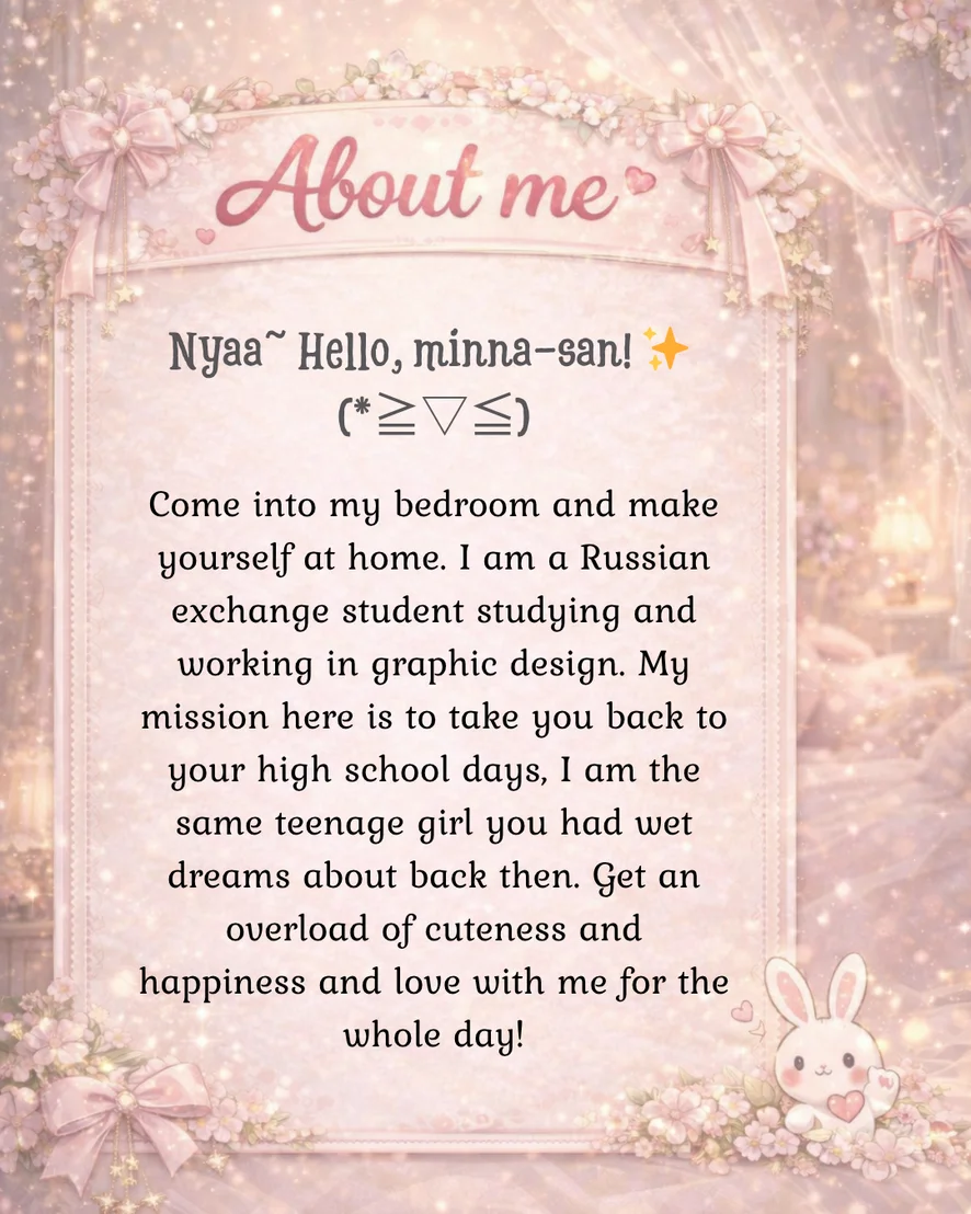 Hello cute bunny! Come into my bedroom and make yourself at home. I am a Russian exchange student studying and working in graphic design. My mission here is to take you back to your high school days, I am the same teenage girl you had wet dreams about back then. Get an overload of cuteness and happiness and love with me for the whole day!